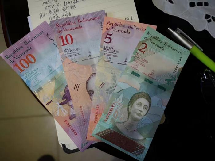 宋琳向我们展示了两种货币,第一种是老货币,不要只看上面的数字,数字下面的西班牙语有时为表面面值加上了几个零。举例来说,货币上的数字为100 ,下面的西班牙文其实是 cien mil,即100000。政府不想在纸币上表现出那么多零,就用这个办法减少人们的视觉冲击。另一种是新发行的货币,这是委内瑞拉马杜罗总统面对货币危机启动的最新改革,两种货币将共同使用到9月底为止。
