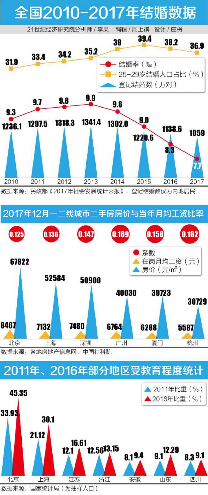 第三则是近年来部分地区的高房价,导致结婚成本增长,从而对结婚率的下降和结婚年龄段的增长有间接影响。