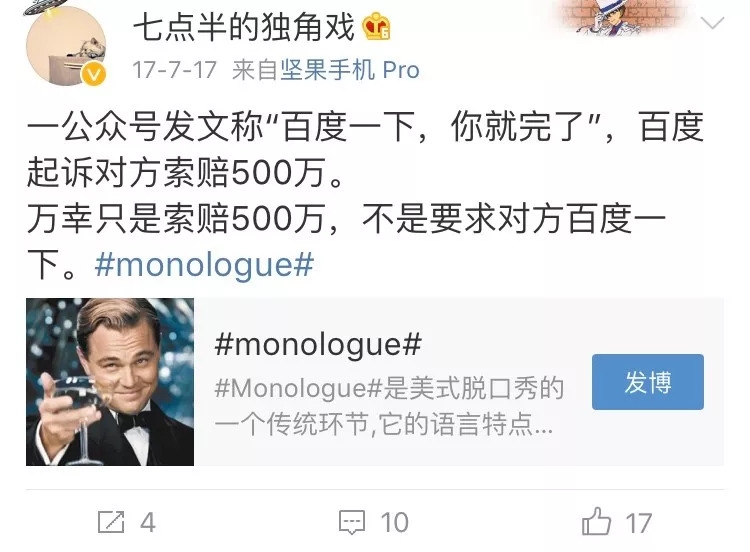 还有网友发现“七点半的独角戏”曾于2017年发过一条关于百度索赔的微博,调侃称“赔偿数字是不是参考的这条?”