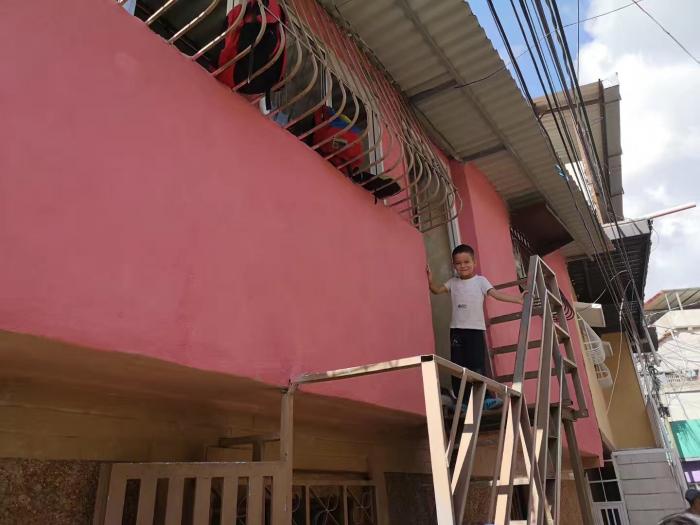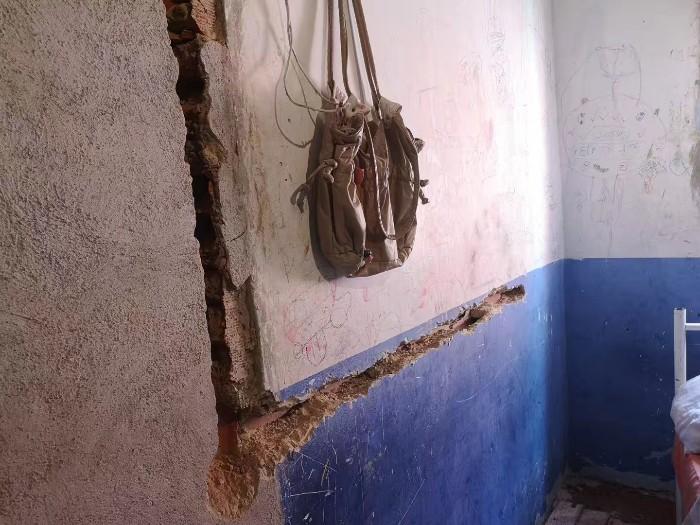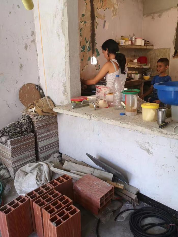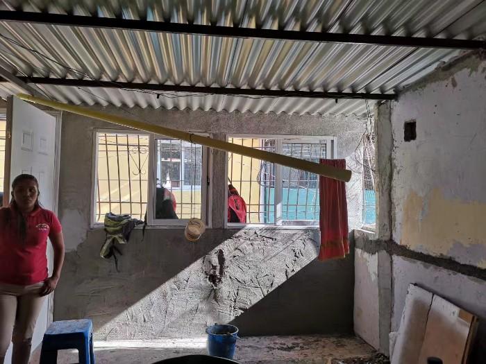 这是蜂巢2021社区正在改造的一户人家。这家因为人口多、房屋陈旧,新三色基金会正为其进行新的改造。从照片可以看到目前房屋的现状:墙皮剥落,客厅中堆满了建筑材料。