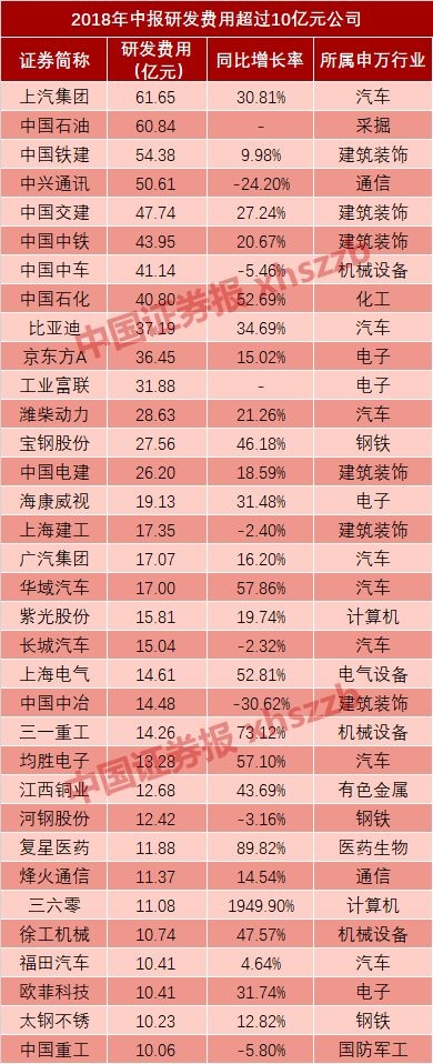 今年上半年,研发费用总金额超过10亿元的有34家上市公司。上汽集团、中国石油、中国铁建、中兴通讯4家公司研发费用均超过50亿元,已经超过了98%的上市公司净利润。