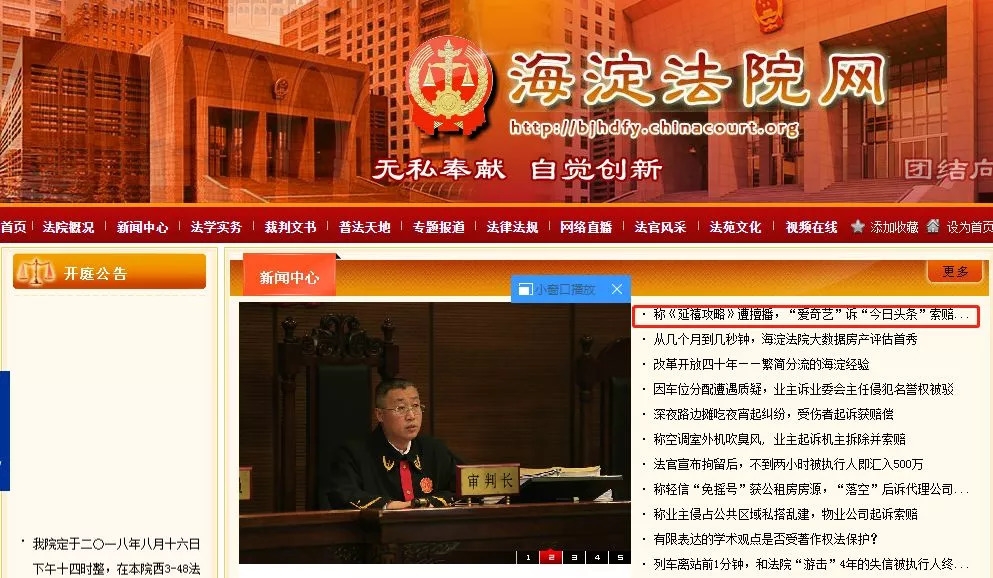 海淀法院网在“案件快报”发布了《称<延禧攻略>遭擅播,“爱奇艺”诉“今日头条”索赔千万》的消息。