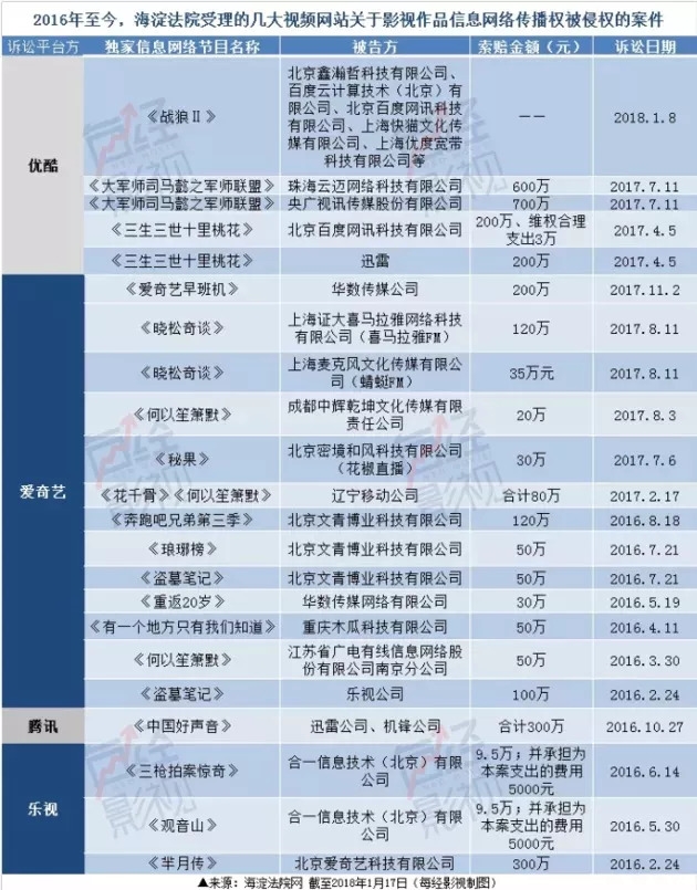 2016年至2018年1月17日,仅海淀法院受理的三大视频网站优酷、爱奇艺、腾讯起诉被侵犯影视作品信息网络传播权的案件就多达19起,索赔金额合计2938万元。