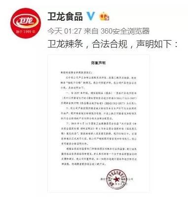 但卫龙并不认同上述抽检结果。9月4日凌晨,卫龙食品官方微博发声明回应湖北食药监,称其产品完全合法合规。