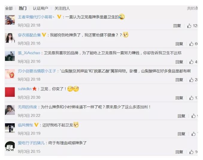 中新经纬注意到,此前有关卫龙辣条抽检不合格的微博评论中,有很多网友感到很诧异,表示不相信卫龙会出现卫生不达标的情况,一位网友说:“一直认为卫龙是很好的形象品牌,让顾客失望了!”