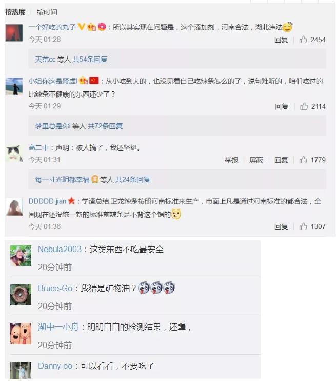 而在这次卫龙回应的微博下面,已经有超过1400条评论,有的网友对卫龙的及时回应点赞,但也有网友认为,卫龙是在和监管部门“抬杠”——“明明白白的检测结果,还犟”。