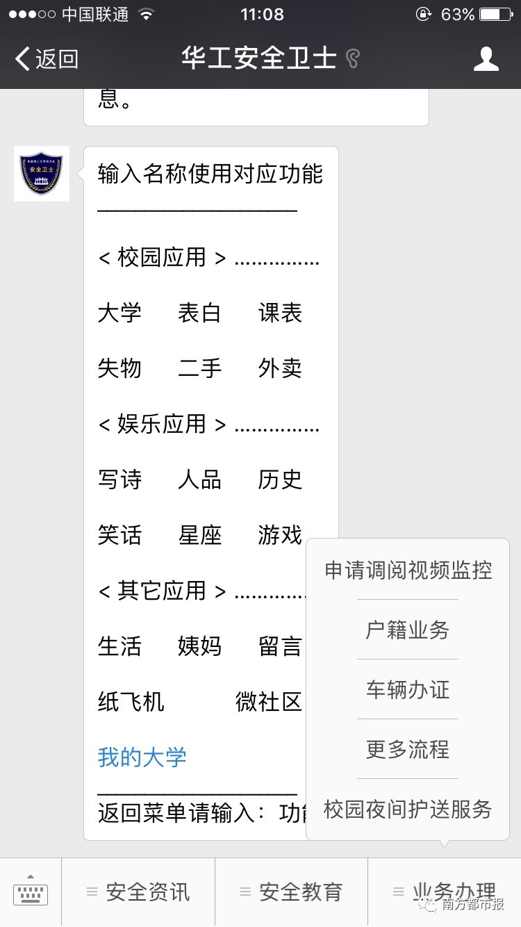 9月3日,华工保卫处官方微信“华工安全卫士”发布文章《重磅发布!我工推出校园夜间护送服务》。具体操作方法为关注该公众号,菜单栏选择“业务办理”,即可线上提前1小时预约校园夜间护送服务。