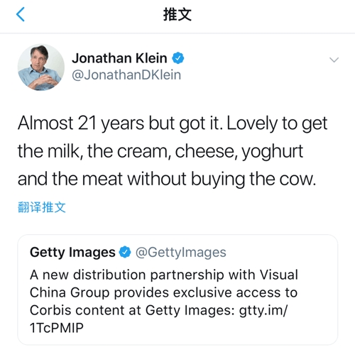 戏剧性的是,视觉中国方面独立收购了世界第三大图库巨头Corbis后,全球第一大图库巨头——Getty不仅未感到威胁,反而喜笑颜开。彼时,Getty联合创始人兼CEO Jonathan Klein公开表态:“等了21年了,终于得到Corbis。多么美妙,我们不用买牛就能得到牛奶、奶油、奶酪、酸奶和牛肉。”