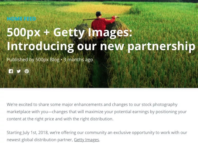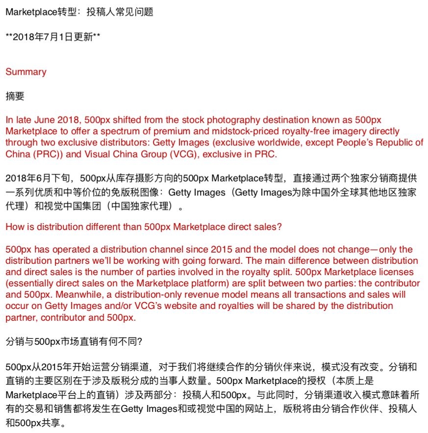 收购后不到半年,当用户再登陆500px时会看到这样的提示:“500px的Marketplace(500px的直接销售平台)已经关停,现在500px的图片只能在Getty和视觉中国购买。”实际上,从2018年7月1日起,视觉中国负责500px在中国的业务,而500px的国际销售业务则全权交由Getty代理。又是Getty!