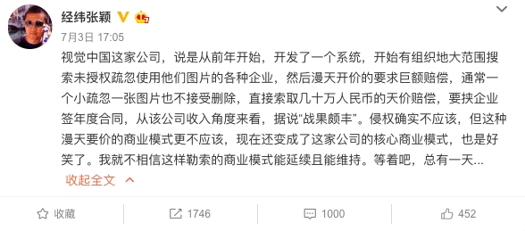 这种商业模式已引起投资界非议。比如今年7月初,经纬中国创始管理合伙人张颖发布微博批视觉中国漫天开价索要几十万人民币巨额赔偿,要挟企业签年度合同。张颖认为,从该公司收入角度来看,据说“战果颇丰”。“侵权确实不应该,但这种漫天要价的商业模式更不应该,现在还变成了这家公司的核心商业模式,也是好笑了。”
