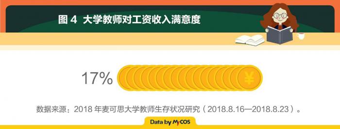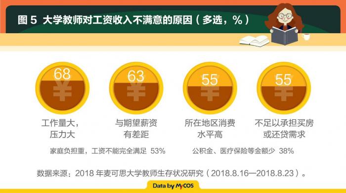 调查还显示,83%的大学教师对工资收入不满意。不满意的主要原因是“工作量大,压力大”(68%),其次因素为“与期望薪资有差距”(63%),认为所在地区消费水平高、不足以承担买房或还贷需求的比例为55%。33%的被访大学教师表示近三年无加薪。