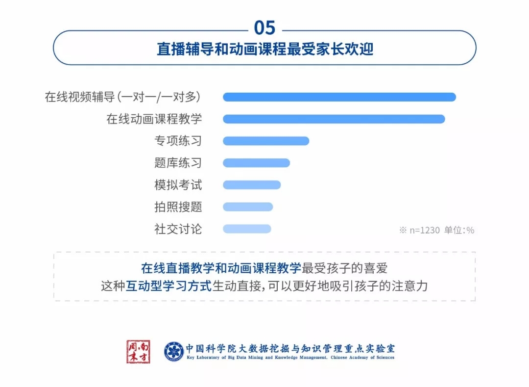 直播辅导和动画课程等更为生动直接的教学形式受到认可。报告显示,做题闯关、视频答疑、观看视频节目和使用学习资料是孩子们最主要使用的线上学习功能。