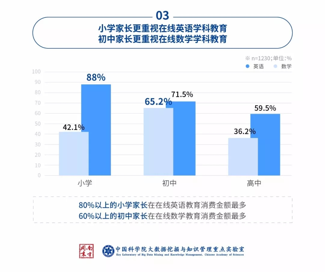 数据显示,小学阶段,家长更愿意为孩子在英语方面投入,而到了初中,家长对数学的重视程度则有明显提升。