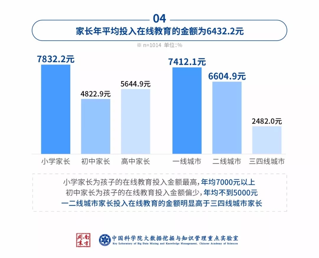 优质在线教育具有口口相传的巨大传播力,使得中国家长心甘情愿为在线教育掏腰包。本次受访结果显示,家长每年为孩子在线上辅导平均花费6432.2元,八成以上家长每年至少支付1000元。小学学段的家长和一线城市家长愿意为孩子支付的线上课程金额最高,超七千元。