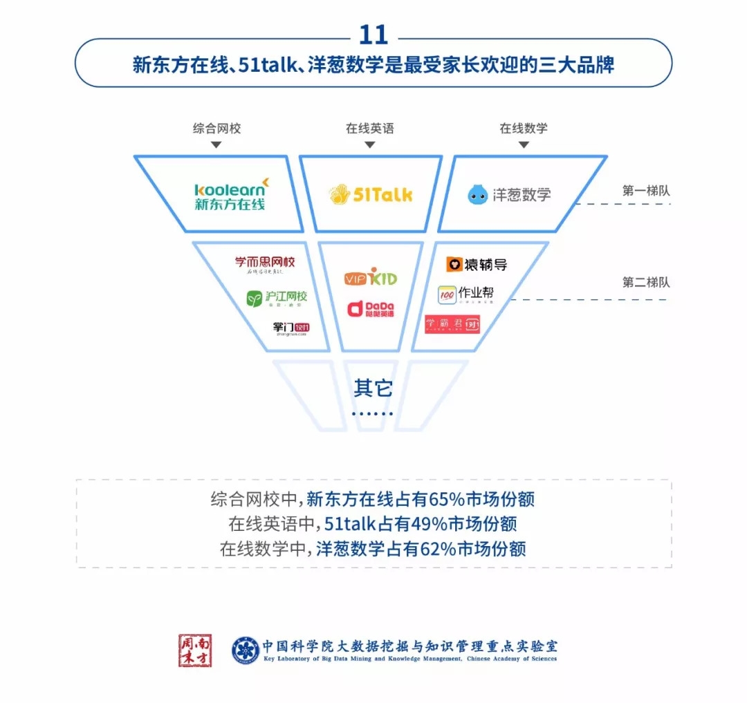 报告显示,知名教育机构更受家长认可。从品牌用户认知度、使用度和美誉度来看,51Talk和洋葱数学分别处于在线英语和在线数学的市场领先位置,新东方在线在综合网校中认可度较高,其余线上教育机构未拉开明显差异。用户体验和学习效果将成为下一个竞争重点。