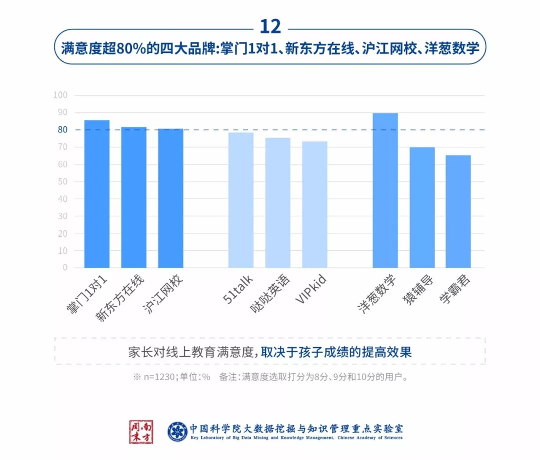 掌门1对1、新东方在线、沪江网校、洋葱数学的使用满意度超八成,家长认同使用后可以帮助孩子提高学习成绩。其中,使用过洋葱数学的家长对该品牌的美誉度超90%。