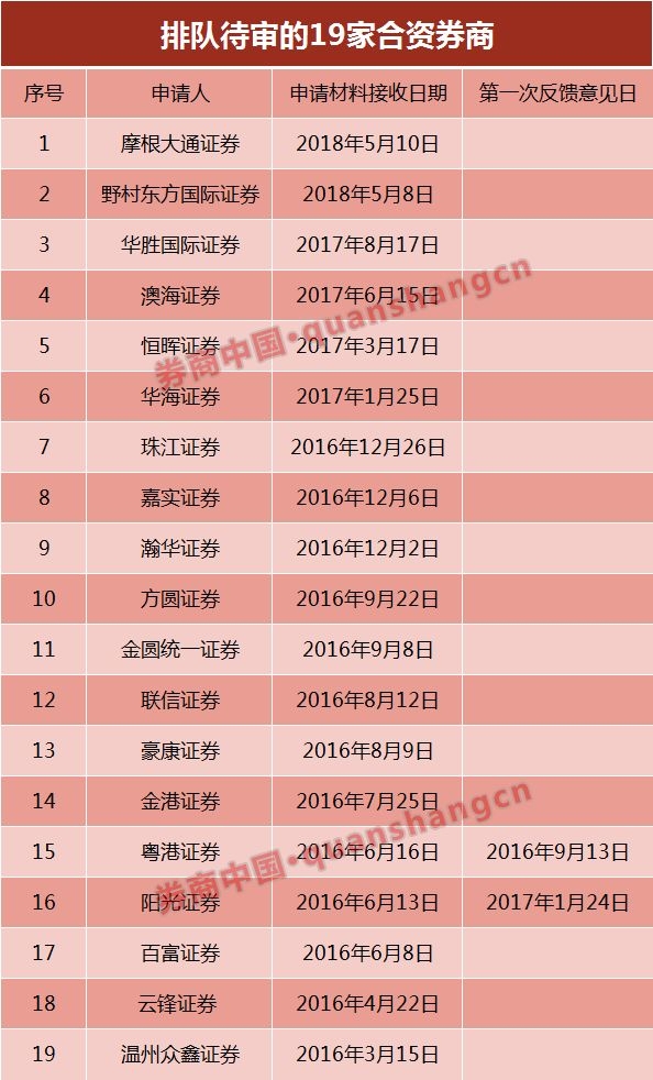 值得注意的是,有4家以往在排队序列的券商已经消失不见,包括了大华继显陆金(云南)证券、恒赢证券、广东粤港证券、横琴海牛证券。