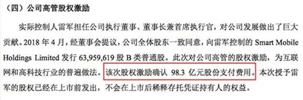 小米招股书显示,4月2日,经董事会提议,小米公司全体股东一致同意,以0.000025美元的价格,向雷军控制的Smart Mobile Holdings Limited发行约6396万股B类普通股。作为股权激励,价值近99亿元的股份,雷军仅需象征性地支付1599美元就可获得,且没有任何附加条件。