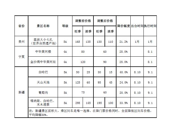 不过,有景区门票降价,也有景区赶在国庆假期之前上调门票价格。如9月1号起,广东丹霞山景区的门票价格由原来平日160元、节假日180元,统一调整为200元;9月16号,国家5A级景区之一的丽江玉龙雪山发布调价公告,宣布门票价格将从每人次105元调整为130元。