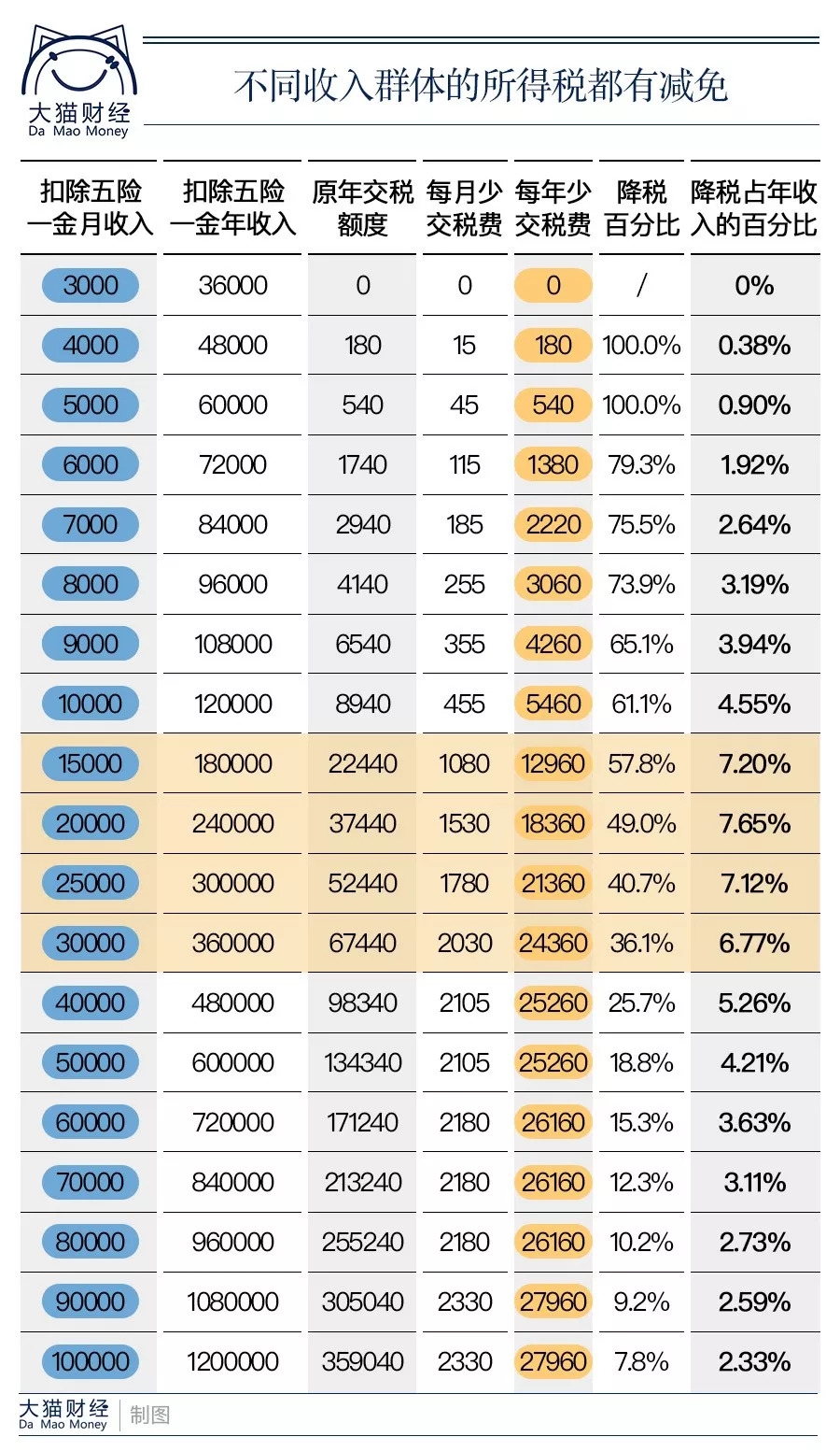 起征点是不是该更高些?税率是不是该再调整下?这些建议大家都可以继续提,但眼下按规定好的来,再修订也是几年后的事情了。整体来说,对不同收入群体的所得税都有减免,这个图比较的清晰: