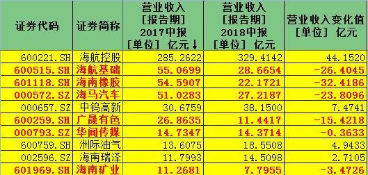 进一步细分来看,重点公司的收入下滑成为主要原因。除了海航控股、中钨高新2家公司实现同比增长外,2017年营收排名靠前的海航基础、海南橡胶、海马汽车和广晟有色均出现明显下滑。