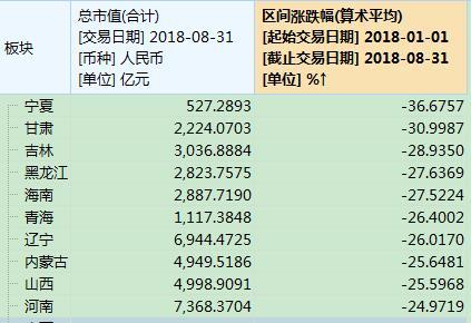 同时,年初以来的二级市场表现也要强于黑龙江、吉林、甘肃和宁夏。据统计,年初至8月31日,海南省内上市公司跌幅(算数平均)为27.5%,而同期甘肃、宁夏整体跌幅均超过30%。