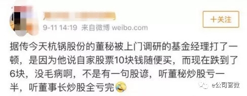 比如杭锅股份,昨日网传因公司股价低董秘被上门调研的基金经理打了一顿。9月12日早盘,杭锅股份高开高走,一度涨逾6%,截至9月12日上午收盘上涨2.53%。截至记者发稿成交总额1229.93万元,换手率0.28%。