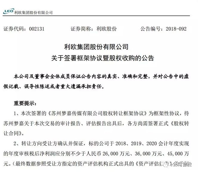 9月11日晚间,利欧股份在公布了公司与苏州梦嘉传媒有限公司股东签署收购意向书的消息之后,公布了该次交易的报价。根据公告,利欧股份拟以现金收购宁波妍熙、宁波熙灿、张地雨所持苏州梦嘉传媒有限公司75%股权。标的公司的整体估值预计为其2018年承诺净利润的12倍,即整体预估值为31.20亿元,本次交易对应的交易金额为23.4亿元。