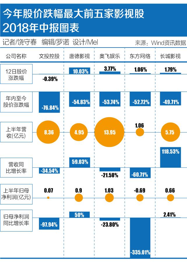 其中,文投控股下跌幅度高达76.84%,为跌幅最大的影视股;唐德影视在12日的涨停刺激下,年内跌幅也仍然高达54.83%,在影视股中跌幅仅次于文投控股。