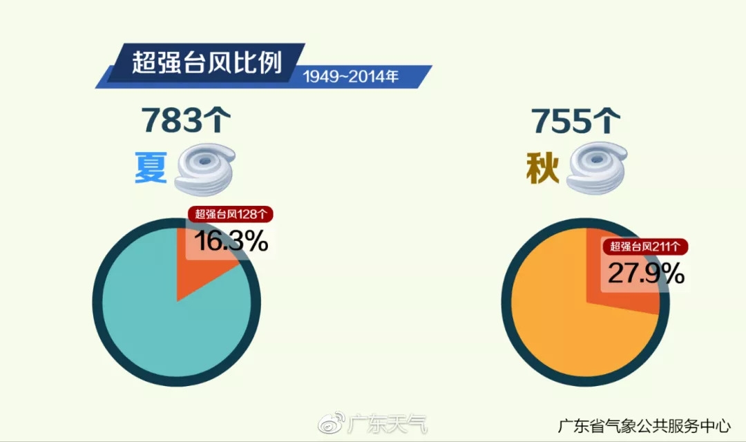 1949至2014年,秋台风共生成755个,其中超强台风有211个,占比27.9%;而这期间,夏台风中超强台风的比例只有16.3%。秋季更容易出现强度更强的台风,这和太阳直射点向南移动造成的海温偏暖有关。