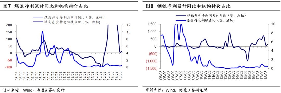 2016年煤炭和钢铁业绩反转,贝塔弹性明显。在本轮震荡行情中,煤炭和钢铁累计涨幅分别为6%、11%,其中2016年相对收益为13、5个百分点,行业涨跌幅排第4、8名,2017年相对收益为-2.5、-7.2个百分点,排第5、9名,2018年相对收益为-4、2个百分点,排第12、8名(截止2018/09/11)。2016年周期股表现抢眼,当时供给侧改革持续推进,以煤炭和钢铁为代表的周期股业绩扭亏为盈,实现从“0”到“1”的突破,进入2017年后周期股业绩增速放缓,对应着股价表现也更差。2015年11月10日,习近平主席首次提出供给侧结构性改革概念,2016年1月27日中央财经领导小组第十二次会议召开,会议强调供给侧结构性改革的根本目的是提高社会生产力水平。在供给侧改革的推动下,上游行业产能收缩、价格上涨,由此带来业绩改善,煤炭归母净利累计同比从16Q1的-21%最高回升至16Q4的893%,钢铁从16Q1的-119%最高回升至17Q4的708%。在2016年1月底上证综指2638点时,煤炭、钢铁PB(MRQ,整体法)为1.1、1.4倍,分别对应2005年以来估值从低到高的6.6%、43.5%。周期类业绩扭亏为盈,加之估值和盈利匹配度不错,这吸引机构投资者迅速加仓周期股,从公募基金重仓股看,煤炭持仓比例从16Q1的0.28%最高升至16Q3的0.84%,钢铁从16Q1的0.31%最高升至17Q3的0.93%。但是,随着去产能逐步完成,政策着力点慢慢向“一补”倾斜,通过控制产能导致的价格上涨不具备可持续性。煤炭归母净利累计同比从16Q4的893%降至18Q2的9%,钢铁从17Q4的708%降至18Q2的128%,业绩回落导致周期股价上涨行情逐渐消弭,煤炭、钢铁行业涨跌幅排名从2016年的第4、8名降至2018年的12、8名。