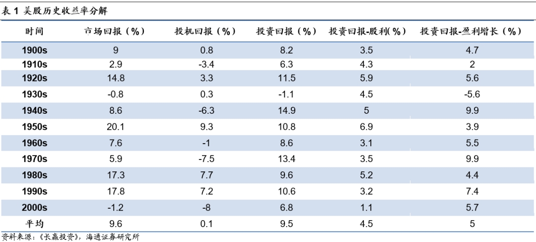 长期看盈利对美股贡献超过95%,无论牛熊盈利都起决定性作用。约翰·博格在《长赢投资》中将股票收益分解为投资收益和投机收益,其中投资收益由股息收益和收益增长构成,对应企业的盈利能力,投机收益由市盈率变动构成,对应企业的估值变化。文中统计1900年以来每10年的收益数据显示,投资收益仅在1930年代大萧条时期出现负值,其余时间基本稳定在8%~13%之间,平均值为9.5%,其中股利回报均值为4.5%,盈利增长回报为5%,企业通过经营创造的收益相当稳定。与此相反,投机收益却随着市盈率的波动大起大落,在-10%~10%之间剧烈波动,但平均值仅为0.1%。可见,股价上涨的核心驱动力是盈利,估值短期波动剧烈但长期趋于稳定,对股价几乎无贡献。另外,从代表指数标普500角度看,长期以来盈利是美股的主角。1929年以来标普500指数年化增速为5.3%,EPS为5.2%,PE为0.1%,盈利是驱动股价上涨的主力,而估值贡献很小。在牛市中,盈利和估值共同驱动美股上涨,1929年以来美股经历4轮牛市,期间标普500年化增速均值为12.5%,EPS为9.4%,PE为2.9%。在熊市中,盈利和估值共同带动美股回落,1929年以来美股经历3轮熊市,期间标普500年化增速均值为-33.6%,EPS为-21.0%,PE为-16.3%。在震荡市中,盈利成为驱动股价上涨的绝对力量,1929年以来美股经历2轮震荡市,期间标普500年化增速均值为2.2%,EPS为7.7%,PE为-5.1%。