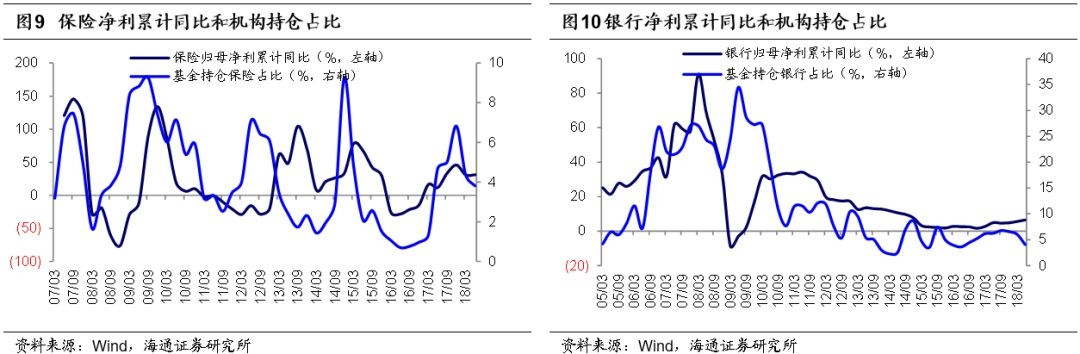 2017年保险和银行为业绩快速改善,迎来重估。在本轮震荡市行情中,保险、银行累计涨幅为97%、25%,其中2016年保险、银行相对收益10、12个百分点,行业涨跌幅排第6、3名,2017年相对收益为62、-5个百分点,排第1、8名,2018年相对收益为6、11个百分点,排第6、3名(截止2018/09/11)。2017年保险表现最优源于业绩反转,进入2018年后业绩增速放缓,对应股价表现更差,2018年银行更优源于业绩持续回暖。从业绩看,保险归母净利累计同比从16Q4的-15%升至17Q4的46%,此后回落至18Q2的31%,银行从16Q4的1.9%升至17Q4的4.8%、18Q2的6.5%。此外,当时金融股低估低配,这也吸引投资者持仓向金融股集中。2017年初中国平安、中国人寿、中国太保PEV分别为0.88、1.02、0.94倍,处在2008年以来估值从低到高的13.9%、14.5%、1.2%,当时银行PB(MRQ,整体法)为0.82倍,处在2005年以来估值从低到高的3%分位。金融股业绩加速好转,加之估值和盈利匹配度不错,这吸引机构投资者进一步加仓。从公募基金重仓股看,16Q4保险、银行持仓比例分别为1.0%、5.3%,随着金融股业绩好转,保险持仓比例最高在17Q4达到6.8%,银行在17Q3达到6.8%。但是,进入2018年后保险和银行业绩分化。今年保险业绩下滑主要源于寿险新单销售下降、保费负增长,原因包括:监管趋严导致保险销售难度增加、去杠杆导致资金面偏紧等,从而保险业绩下滑带动股价回调。今年以来银行业绩仍在改善,这引发今年1月银行股大涨12.5%。但是,随着今年去杠杆持续推进,银行委外业务收缩,市场担忧这最终将拖累银行业绩,加之在宏观经济增速放缓背景下,作为宏观经济的缩影的银行业绩也恐难有大起色,从而银行股在年初大涨后股价略回落。