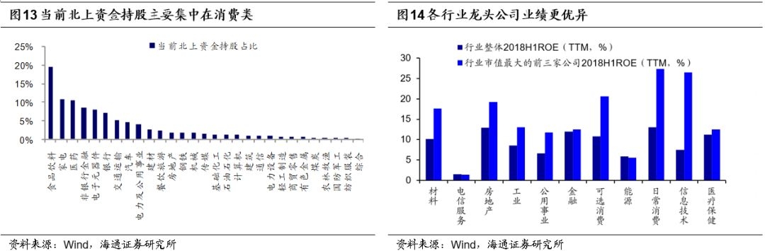 2016-2017年食品饮料和家电业绩快速改善,股价相对收益明显。在本轮震荡行情中,食品饮料和家电涨幅居前,成为本轮行情的中坚力量,期间涨幅分别为82%、41%,其中2016年相对收益(基准为沪深300,下同)为19、13个百分点,行业涨跌幅排第1、2名,2017年相对收益为33、23个百分点,排第2、3名,2018年相对收益为7、-7个百分点,排第7、22名(截止2018/09/11)。2016-2017年消费白马股表现最优异,源于当时业绩改善最显著,进入2018年后消费白马股业绩增速放缓,对应股价表现也更差。从业绩看,食品饮料归母净利累计同比从16Q2的9%最高升至18Q1的31%、18Q2回落至30%,家电从16Q1的15%升至17Q4的28%、18Q2回落至21%。在2016年1月底上证综指2638点时,食品饮料、家电的PE(TTM,整体法)为24.9、17.5倍,分别对应2005年以来估值从低到高的17%、40%分位数。食品饮料和家电估值和盈利匹配度较好,这也吸引了机构投资者持续加仓。从公募基金重仓股看,食品饮料持仓占比从16Q1的4.4%升至18Q2的14.4%(2005年以来均值为8.5%),家电从2.8%升至8.0%(2005年以来均值为3.4%),特别是2017年基金加仓最快,持仓食品饮料、家电占比分别提高了8.2、3.2个百分点。另外,近两年外资持有A股占比正逐步上升,从最新陆港通北上资金持股结构看,主要集中在消费股,截止2018/09/07,持仓规模最大的行业分别为食品饮料、家电,持仓金额为1309、711亿元,占比为19.3%、10.5%。