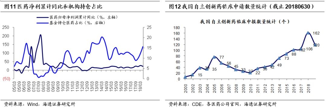18年医药行业异军突起,源于业绩加速改善。今年以来A股较弱主要源于国内去杠杆导致资金面偏紧和中美贸易争端升级导致市场悲观情绪发酵,大部分行业表现惨淡,医药行业异军突起,今年以来最大涨幅达36%,相对收益为9个百分点(截止2018/09/11)。今年医药行业上涨主要源于业绩加速改善,本轮医药业绩回升始于17年,进入18年业绩加速改善,归母净利累计同比从17Q1的14%升至17Q4的21%,18Q1进一步升至28%,18Q2略回落至23%,医药业绩向好驱动股价上涨,机构随之加大配置力度。从公募基金重仓股看,17Q1医药持仓比例为12.0%,较自由流通市值低配0.9个百分点,到2018Q2医药持仓比例为15.6%,较自由流通市值超配3.2个百分点。从陆港通北上资金看,17年底北上资金持有医药498亿元、占比9.4%,而截止2018/09/07持有704亿元、占比10.3%。期间5月底医药股价遭遇回调,这既是因为市场整体行情低迷,也是因为疫苗事件动摇市场对创新药的信心。近期疫苗案问责结果出台,药监管理层调整之后,我们认为国内创新药发展将延续。2015年以来CFDA(现为CDA)积极推动解决药品注册积压问题、建立优先审评审批制度及MAH制度、加入ICH、开展仿制药一致性评价等一系列改革,与国际接轨,鼓励药品创新,树立一股药政新风,近三年以来部分重塑中国制药业生态,使国内创新药行业初具制度基础,并取得一定成绩。从市场需求角度看,中国人口老龄化程度正在加深,据我们测算2018我国平均年龄达40岁,老龄化人口对医疗需求增大,这将支撑我国医药行业的发展。从盈利周期看,一般医药行业持续2-3年,而本轮盈利周期仅持续了1年多,18Q2归母净利同比/ROE(TTM)为23%/12.0%,略高于2005年以来中位数为19%/11.4%,医药业绩仍处在回升趋势中。