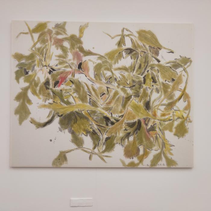 《荠菜》系列的创作同样来源于生活。荠菜是邬一名最喜欢的蔬菜,有次择菜时,这种普通的野菜呈现出的柔弱感突然令邬一名感到可惜,由此引发了他创作的冲动。出人意料的是,本次展览呈现的《荠菜》系列作品都是大尺寸画作。当荠菜以超出常规十几倍的大小出现在画面上时,纠缠的枝叶呈现出气象万千之态。在墨色与留白之间,邬一名刻意留下一些看似未完成的笔触,由此让画面的生命力得以延展。