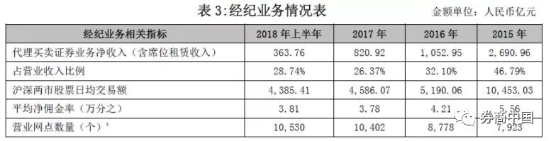 中国证券业协会数据显示,2018 年上半年行业平均净佣金率为万分之3.81,与2017年上半年相比基本持平。也即佣金率加速下滑的态势已经结束,近阶段已进入缓慢下跌的阶段。
