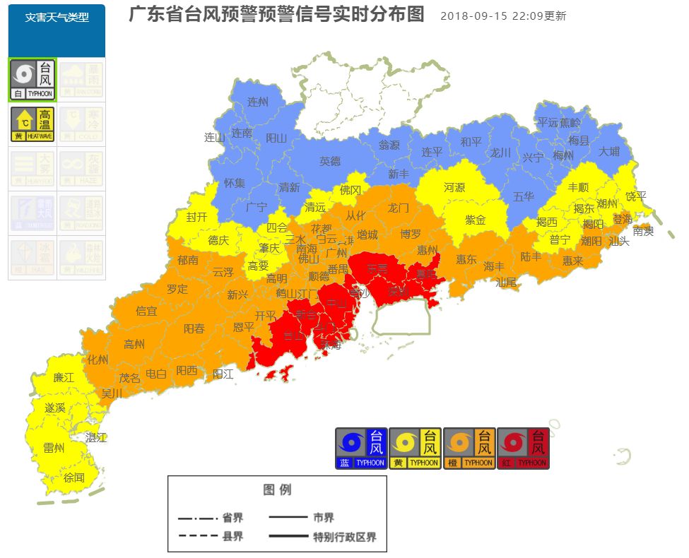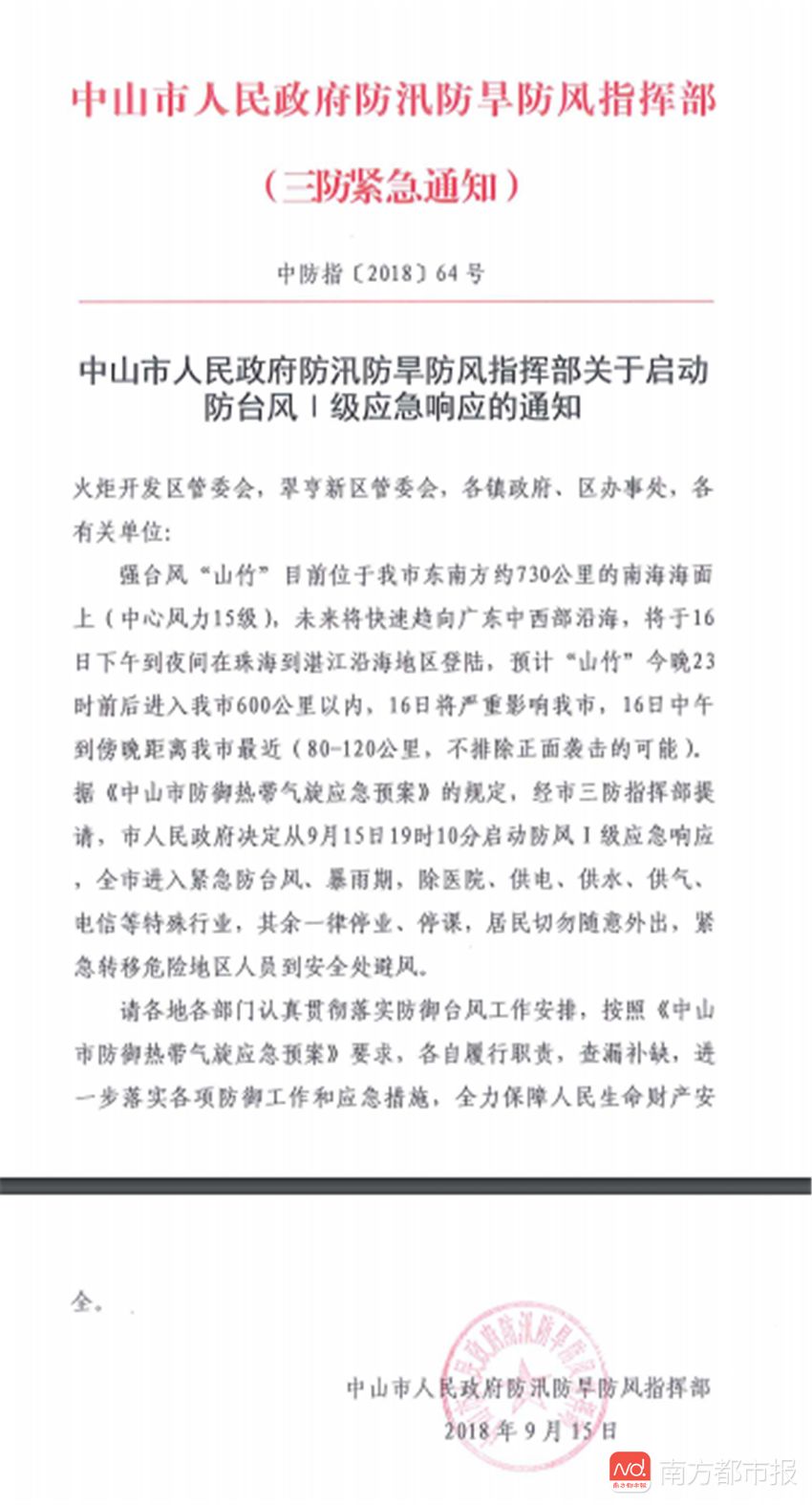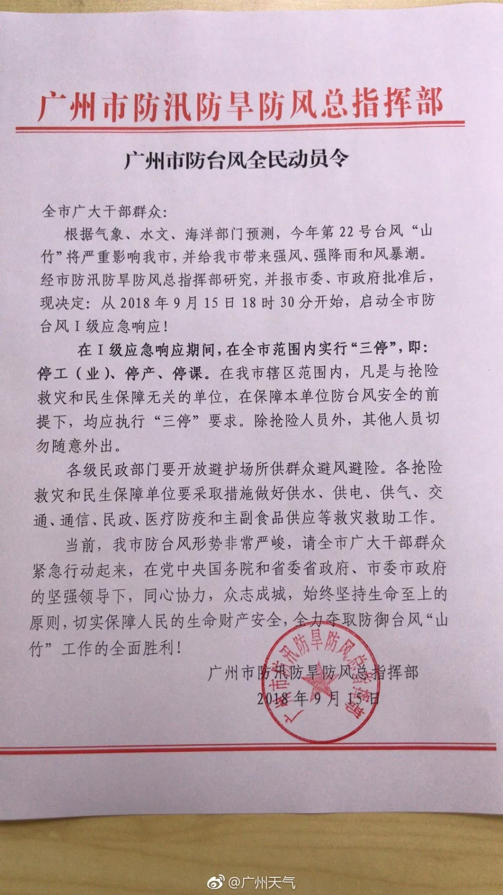 广州市人民政府决定从2018年9月15日18时30分开始,启动全市防台风I级应急响应,除医院、供水、供电、供气、电信等特殊行业,在全市范围内实行“三停”,即:停工(业)、停产、停课。请广大市民群众提前做好防范,正确防灾避险。