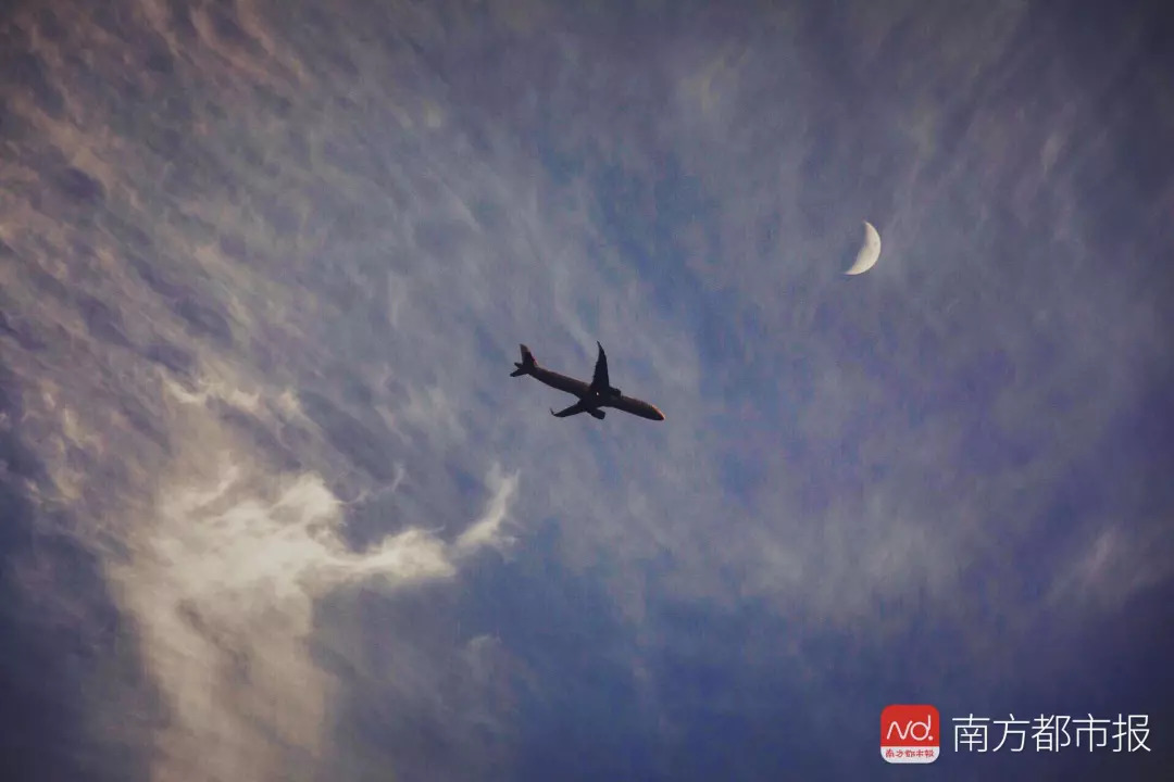 广州番禺南浦,云被风吹散,飞机穿过有月亮的天空。南都记者 谭伟山 摄