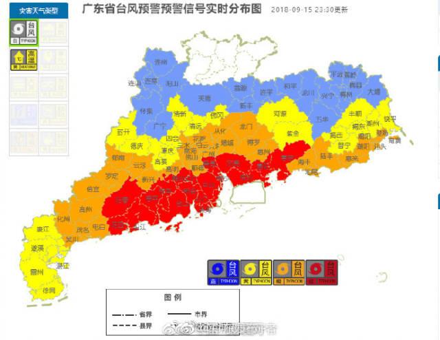 截至9月16日0点,除韶关外广东全省都发出台风预警,其中珠三角沿海城市全线红色预警。这是新预警制度以来,广东省最大规模的台风预警。 16日00时,台风山竹(强台风级)中心位于北纬19.6度、东经117.3度,距离广东省江门台山市东偏南方向约550公里,中心附近最大风力15级(50米/秒)。预计“山竹”将以每小时31公里左右的速度向西偏北方向移动,强度还将有所增强。