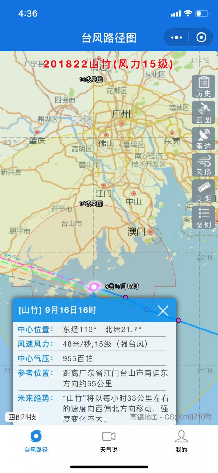 16日16时,省气象台发布最新消息,今天中午15时,台风“山竹”(强台风级),中心位于北纬21·6度,东经113·3度,也就是在阳江市东南方向约110公里的南海北部海面上,中心附近最大风力15级,达到48米每秒的风速,中心最低气压955百帕,8级大风范围半径约350公里。