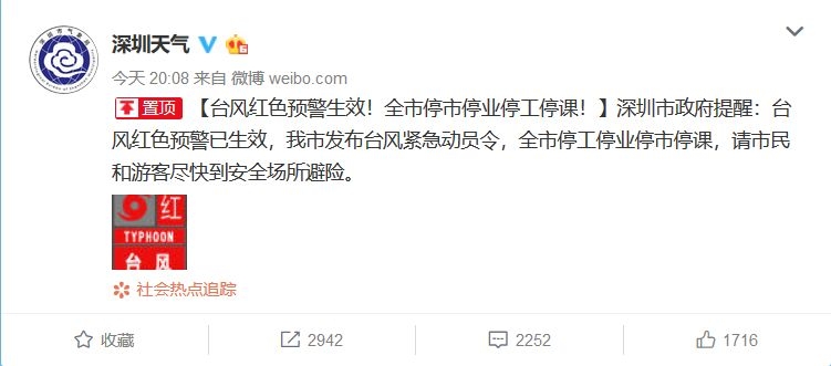 昨晚(9月15日)20:00左右,@深圳天气 微博发布消息称,深圳市政府提醒,台风红色预警已生效,深圳市已经发布台风紧急动员令,全市停工停业停市停课,请市民和游客尽快到安全场所避险。