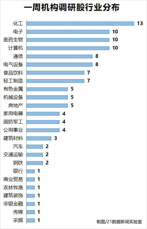 从行业看,化工行业最受关注,13家公司获机构调研,其次为电子、医药生物和计算机,机构均分别调研了10家上市公司,这几个行业都是近几周的热门行业。