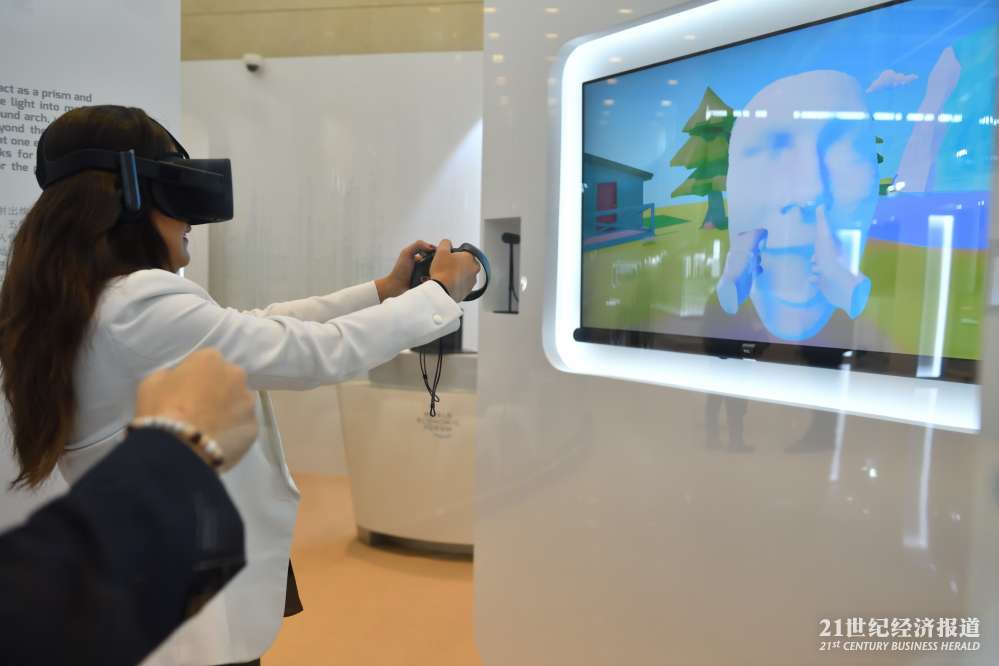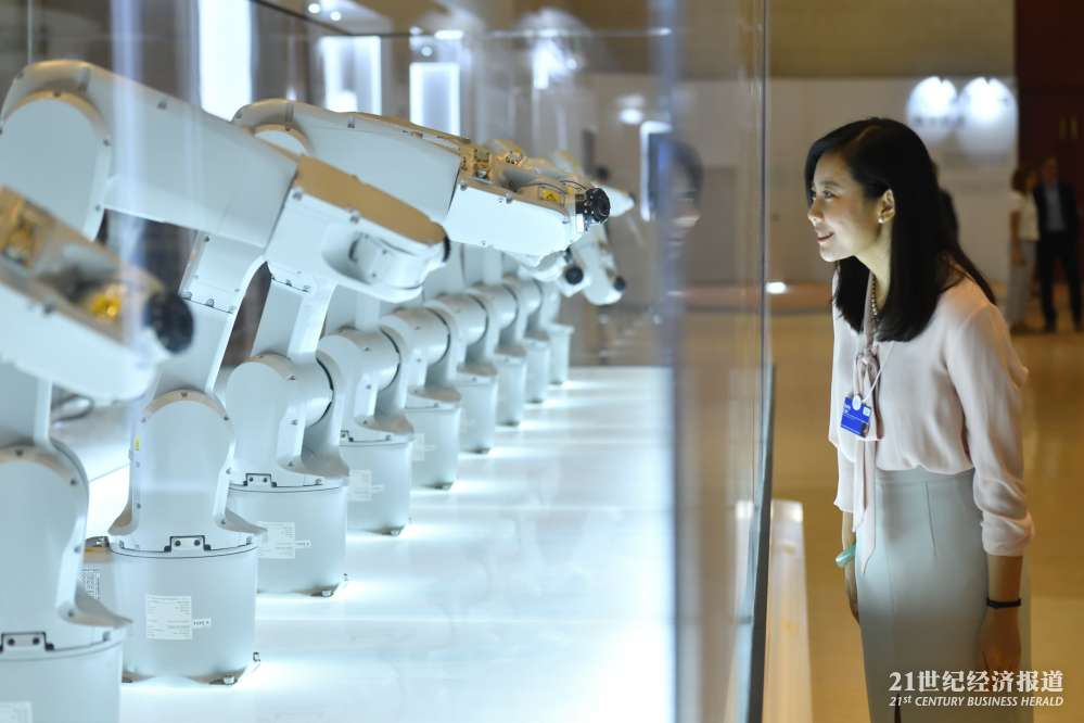 (21世纪经济报道摄影记者 陈逸航天津报道)互动装置:感知机器Manus。会对挥手者做出回应,在人与机器之间培养共情。由设计师Madeline Gannon设计,并获得ABB和NVIDIA的支持。世界经济论坛第12届新领军者年会(俗称夏季达沃斯)将于2018年9月18日至20日在中国天津召开,本届年会将是迄今为止规模最大的以第四次工业革命为主题的世界经济论坛峰会。