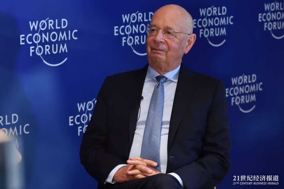 世界经济论坛创始人兼执行主席施瓦布(Klaus Schwab)正在论坛直播间接受采访。