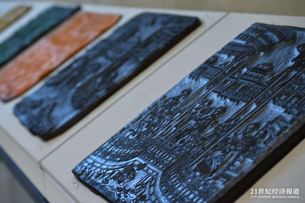 会场走廊上陈列的天津杨柳青木版年画套色版:《藕香榭吃螃蟹》印版。制作工艺包括了木板套印与人工彩绘两部分,是中国保存古版最多的年画分支。