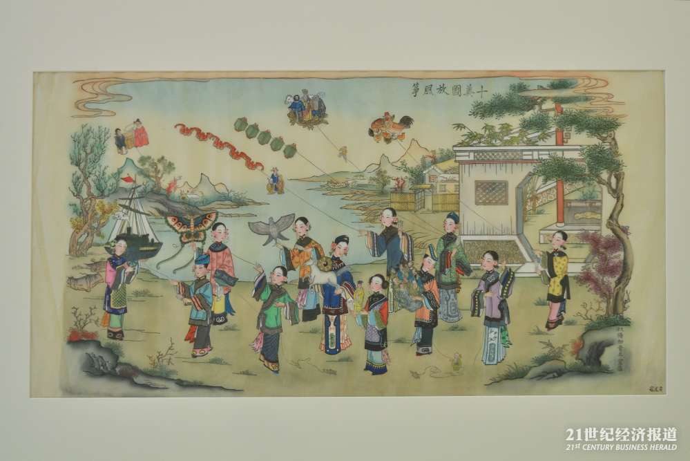 天津杨柳青木版年画《十美放风筝》。风筝始为木制,是古代战争中传递军事信息的工具。在没有影像制品的时代,年画是民众学习知识的重要载体之一,表现内容包罗万象。