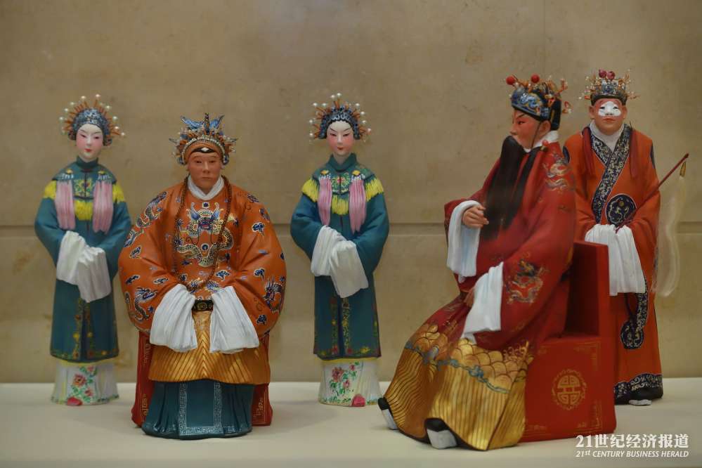 天津泥人张彩塑《龙凤呈祥》局部。作者陈毅谦。戏剧题材创作是泥人张彩塑工作室之所长。该作品取材于京剧《龙凤呈祥》中甘露寺相亲一折。正面端坐着的是吴国太,右边抚须者为蜀国国君刘备。