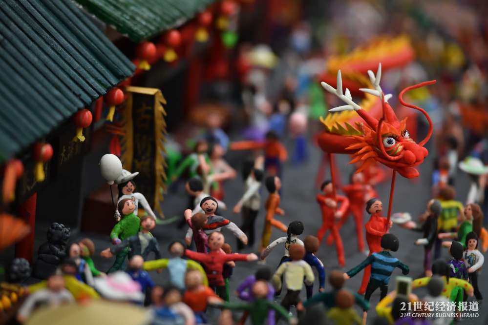 塑作《天津味道——津门故里》局部。由6-15岁的儿童集体创作。作品尽可能完整地呈现古文化街在节庆时期的民俗活动景象。融合了纸工、雕塑和设计的元素。