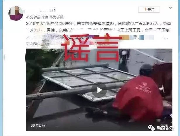 今天台风“山竹”来势汹汹,东莞人众志成城。可是还是有人在微博、朋友圈翻炒一段旧的视频。视频中几个人正围在倒塌的路牌旁边嚎哭,旁边还有人在围观,末尾一闪而过“玉苍”字样。经核实,这件事不是发生在东莞!早在今年7月,浙江“台州晚报”就对这段视频辟过谣,明确指出这件事发生在浙江温州。下面有图有真相。现请广大网友不造谣、不信谣、不传谣。